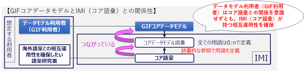 IMIのコア語彙は共通語彙基盤の基礎をなすもので、氏名や住所等の社会活動に必要となる様々な用語を語彙として構造的に定義しています。IMIは海外語彙との相互運用性を確保するなど語彙の専門家の利用を想定して整備されています。一方、IMIではGIFのコアデータモデルを表現するために必要となる用語群をコアデータモデル語彙としても提供いたします。コアデータモデル語彙はIMIのコア語彙を利用して定義することとしています。GIFのコアデータモデルは、このコアデータモデル語彙を参照して定義されているため、GIFのデータモデル利用者はIMI(コア語彙やコアデータモデル語彙)を意識することなく、コア語彙が持つデータ相互運用性を確保することが可能になります。