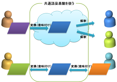 共通語彙基盤を使うとは、オープンデータの作成・活用や他の組織とのデータ交換など外部の人や組織と間でデータをやりとりする際に、データを提供する側が共通語彙を用いてデータに意味付けし、データを利用する側が共通語彙で示された意味にしたがって、データを解釈することです。